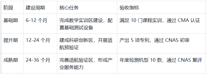 在基础期,建设的重点是搭建教学实训区,为学生提供一个良好的实践学习环境。配置基础测试设备,如无人机飞行模拟器、基础测试仪器等,满足《无人机飞行原理与实践》《无人机组装与调试》等 10 门课程的实训需求。同时,积极申请 CMA 认证,建立完善的质量管理体系,确保实验室的测试数据准确可靠,为后续的发展奠定坚实的基础。