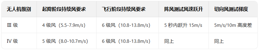 作为我国首ge专门针对无人机抗风性能的国家标准,GB/T 38930-2020 将轻小型旋翼类无人机(起飞重量 0.25-150kg)分为Ⅲ 级(4-15kg)和Ⅳ 级(15-116kg),并规定了持续风、阵风、切向风三种风型的测试条件: